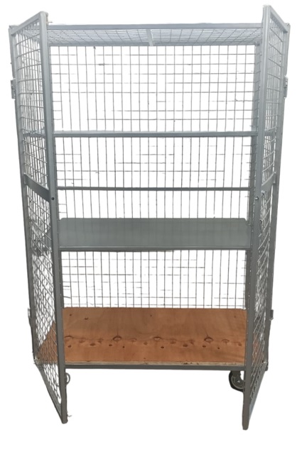 Roll Container Jaula fabricado en acero, fondo, laterales y puerta en malla 50/50 bandejas mdf 15mm/acero – estructura perfil 20x20x1.5 – Ruedas 5x2HD – 2 fijas y 2 giratorias. Pintura Electrostática.